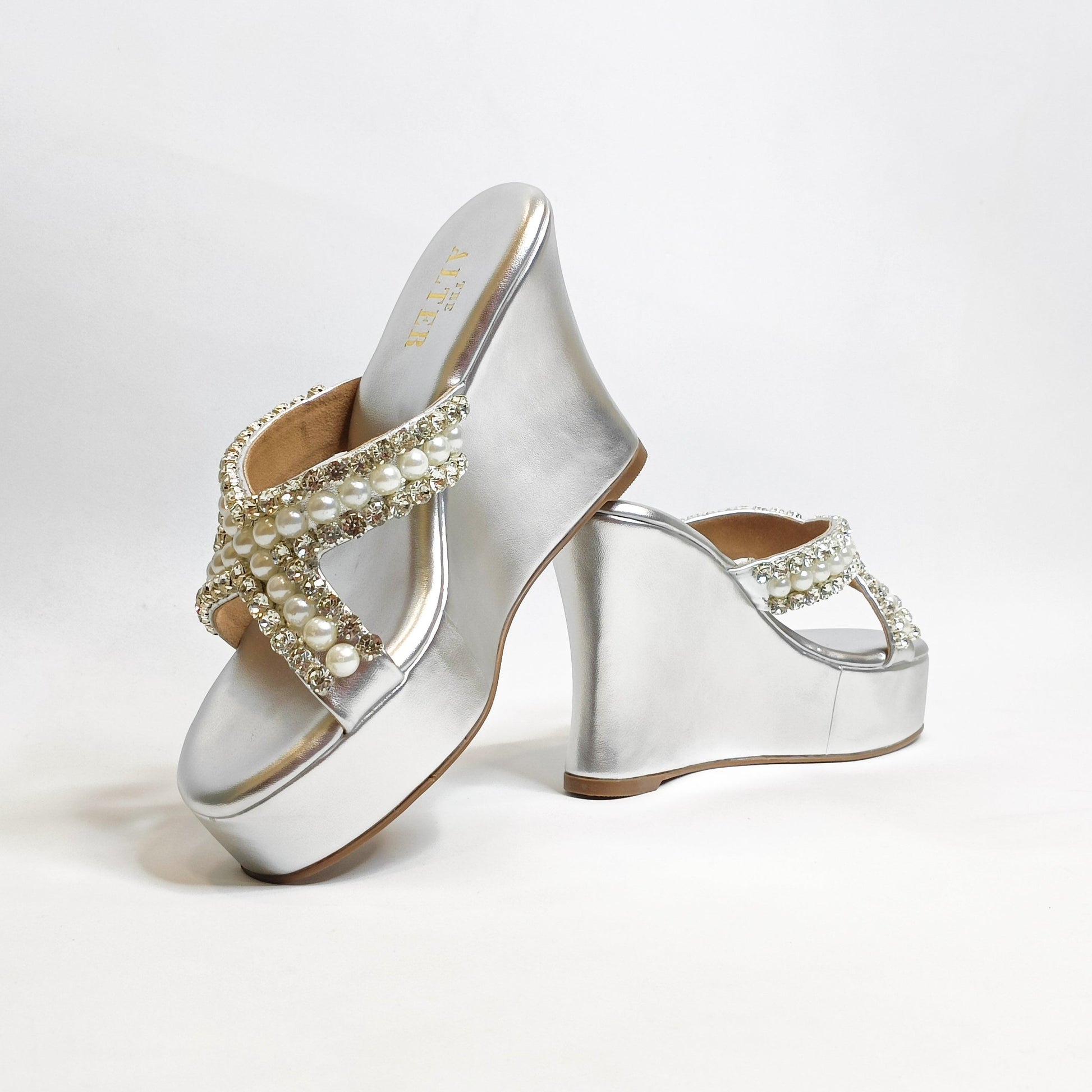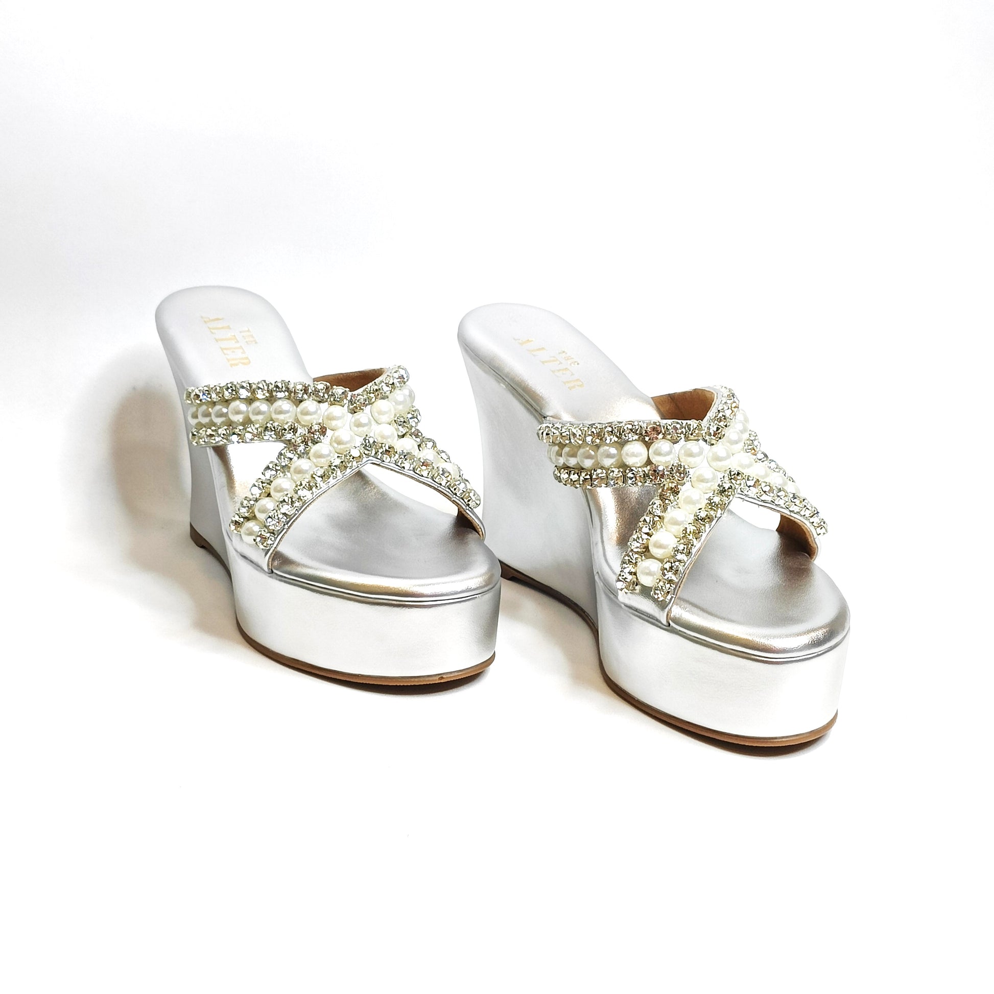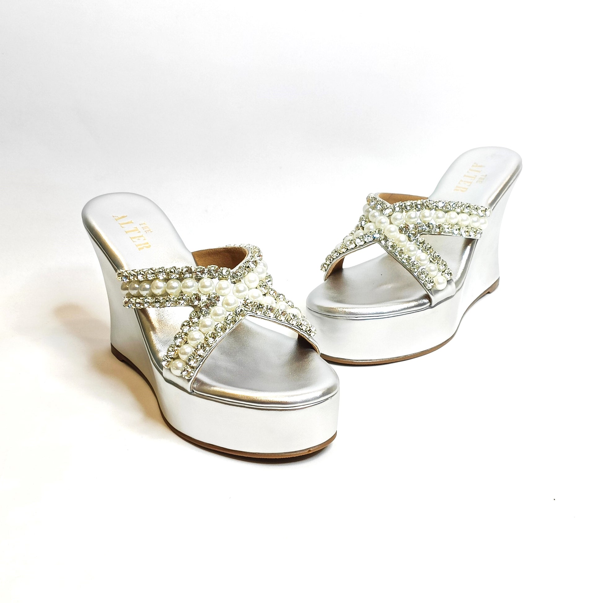 This seasons most awaited, sparkling Embellished Criss Cross Wedges with rhinestone and pearls embellished detailing is just the pair you need to dazzle your festive look. Our Go to pair for not just comfort but the pretty embellishments too!