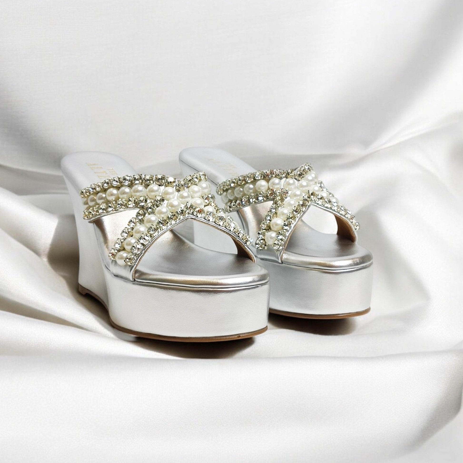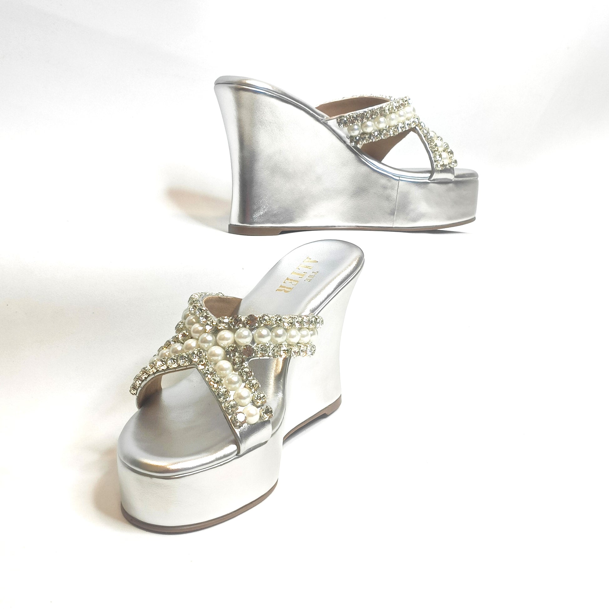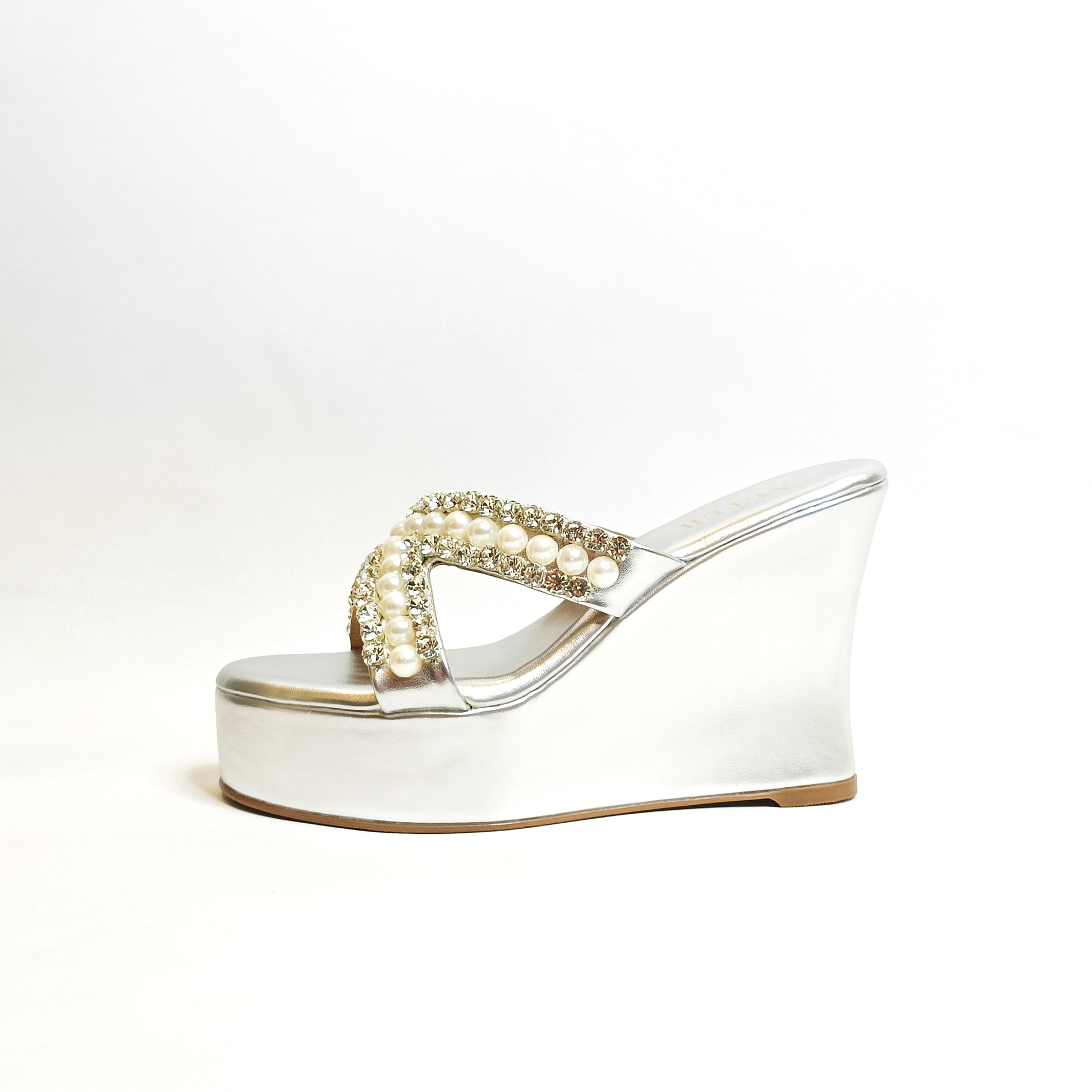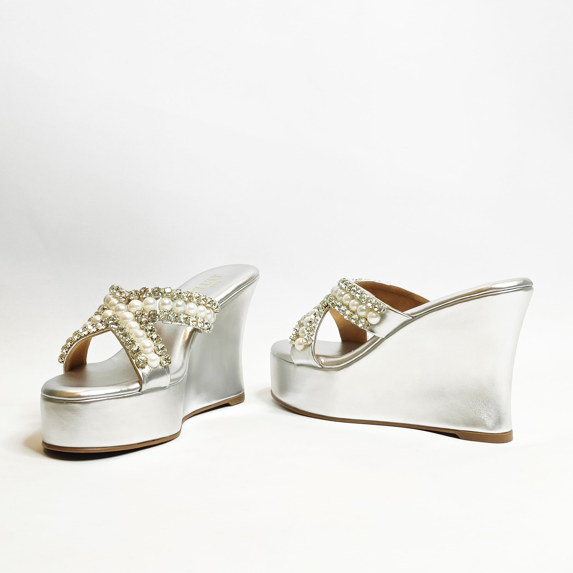 This seasons most awaited, sparkling Embellished Criss Cross Wedges with rhinestone and pearls embellished detailing is just the pair you need to dazzle your festive look. Our Go to pair for not just comfort but the pretty embellishments too!