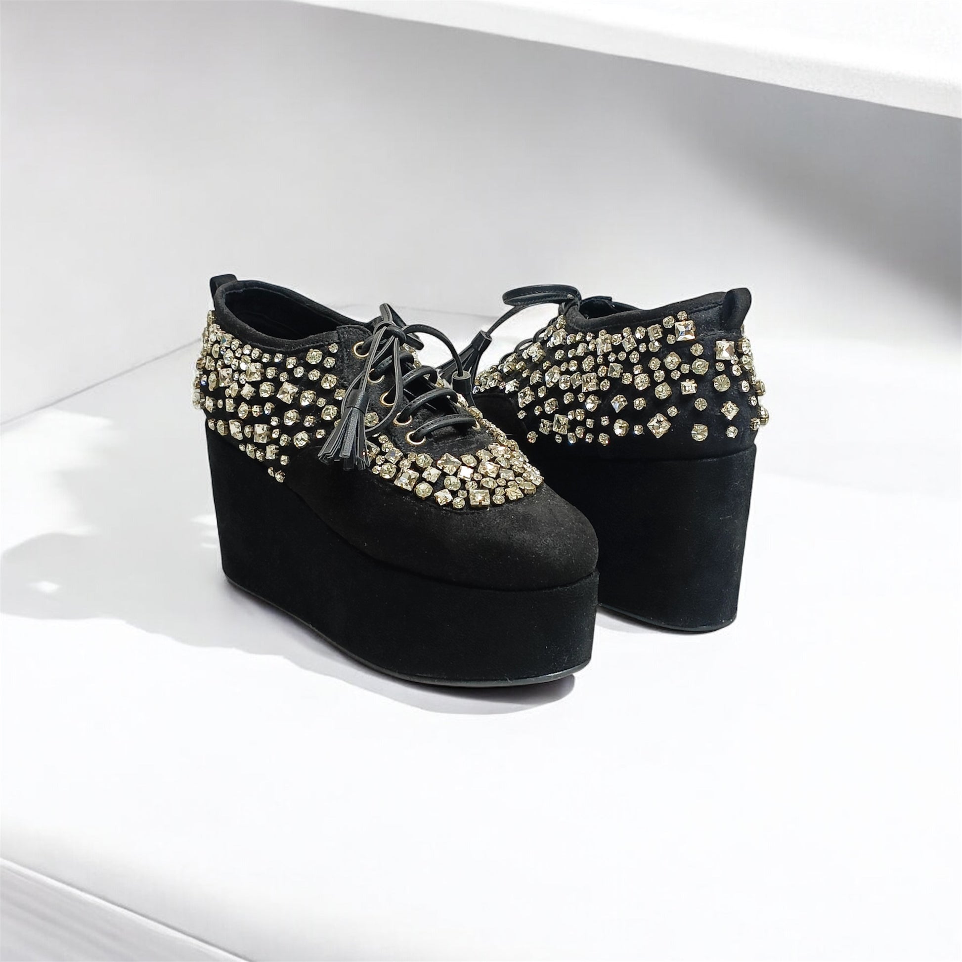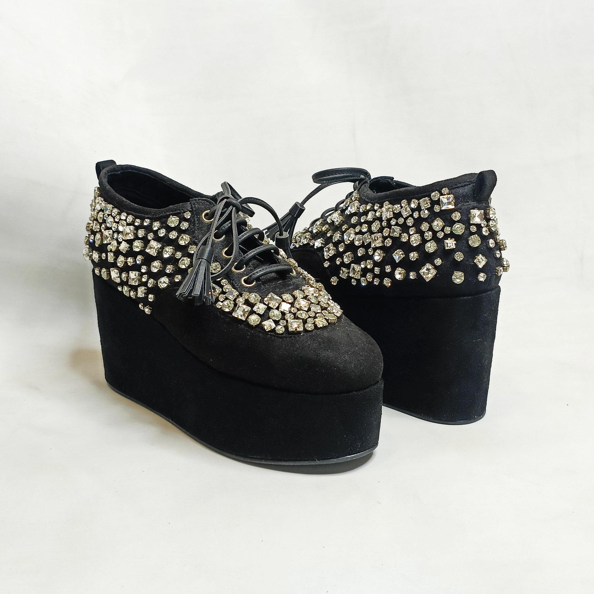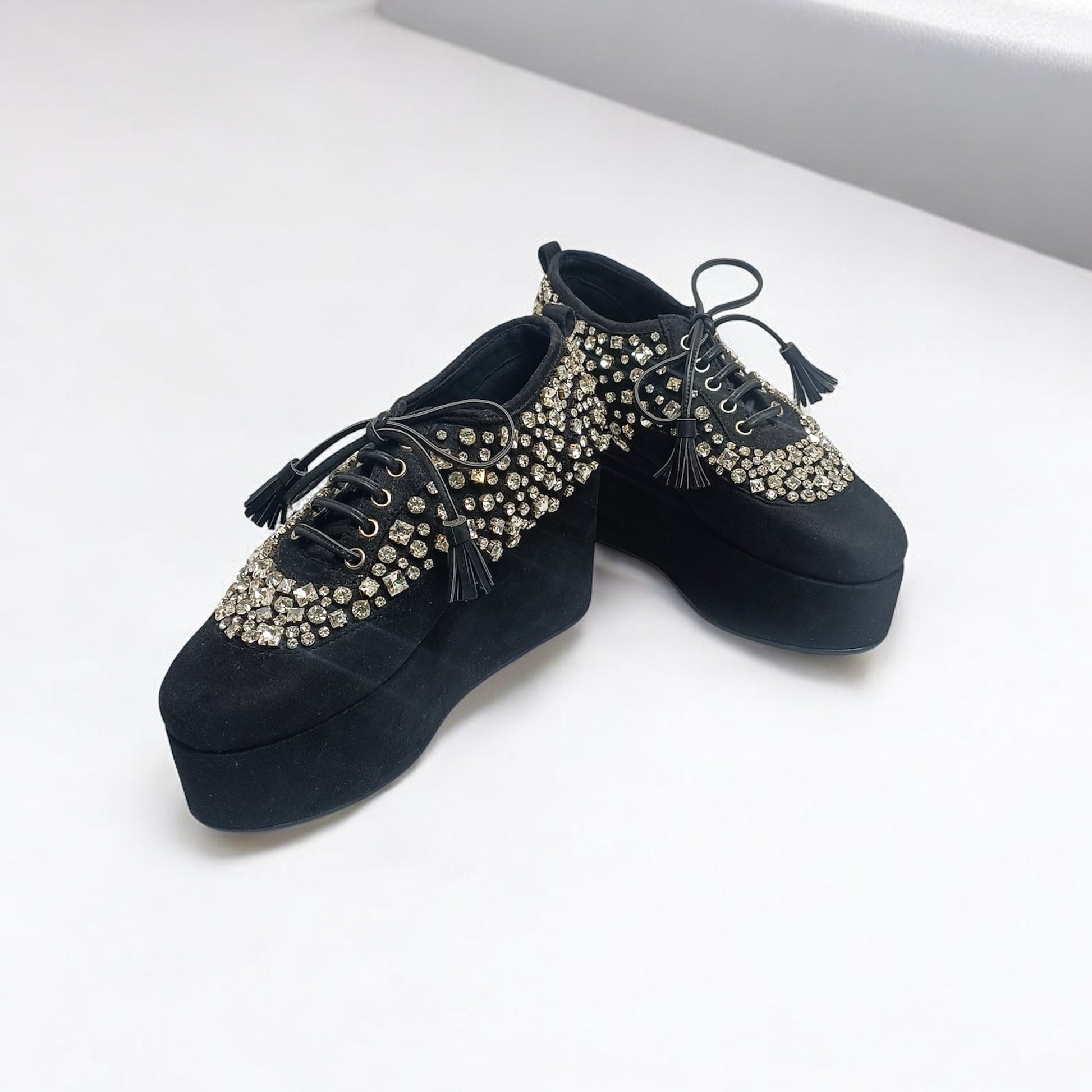 The coolest bridal sneakers are here, these stunning blingy rhinestone embellished black platform sneakers are handcrafted to perfection using premium quality vegan leather. Wear it down the aisle or on the dance floor all night; you're surely never losing your spotlight.
