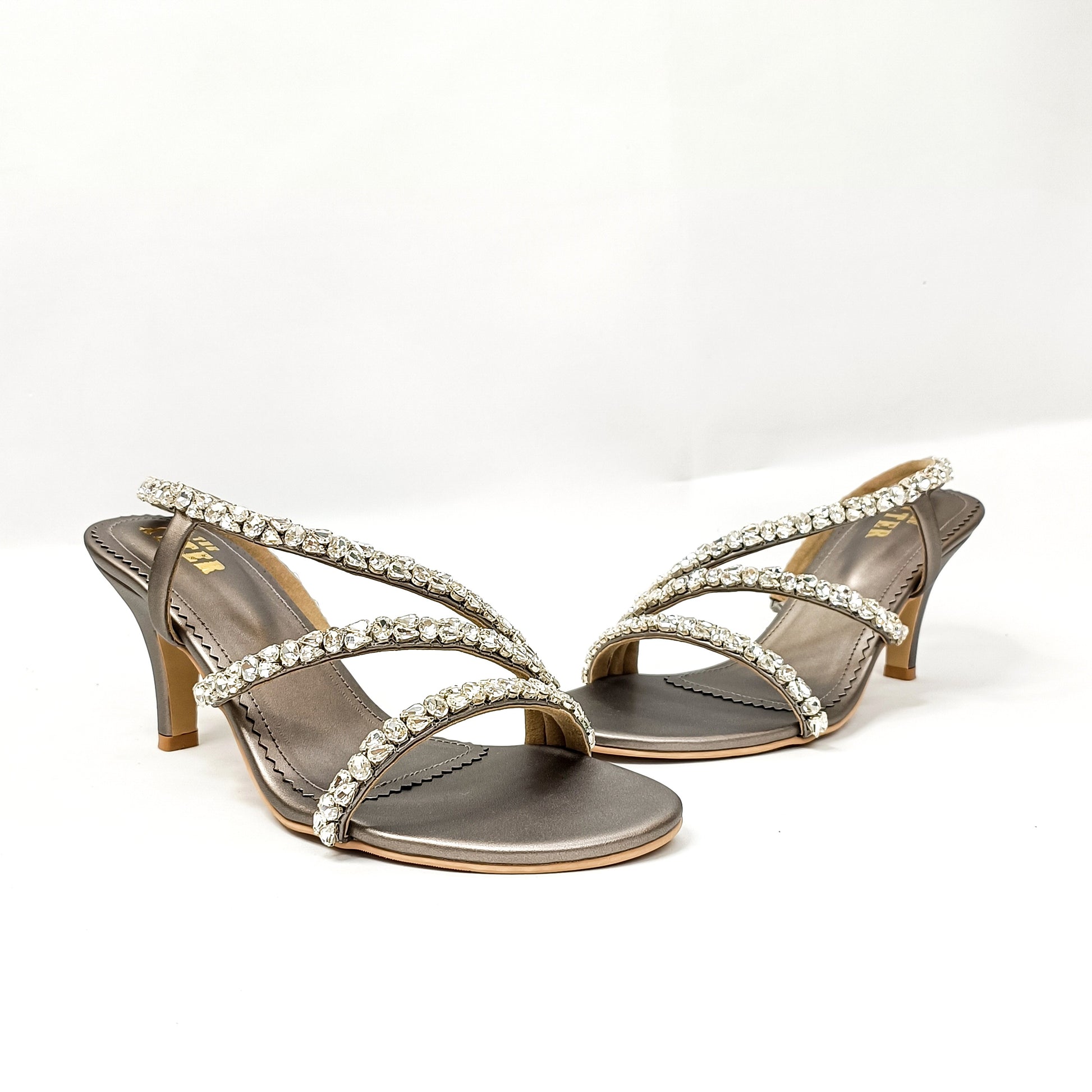 Make a bold & striking statement wearing our Exclusive Bridal Collection, Kiara Round shaped Embellished Pencil Heels. These Stunning Pair are intricately designed with Rhinestones along with in a fabulous combination of premium faux leather featuring, round shaped open toe strappy silhouette.