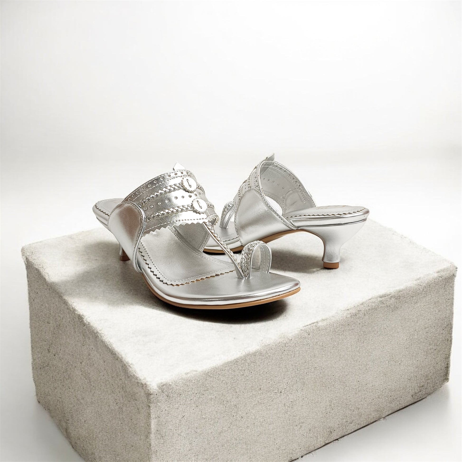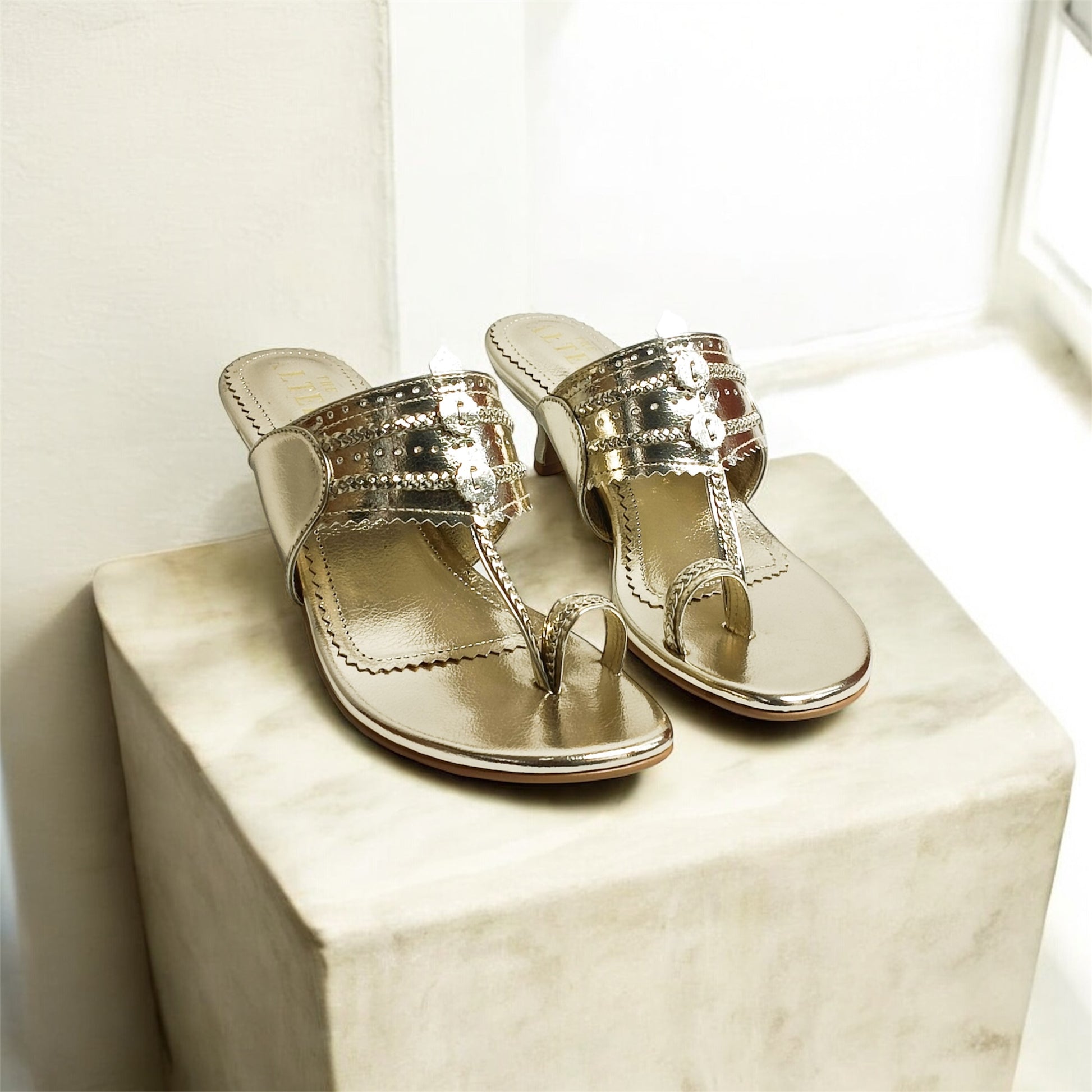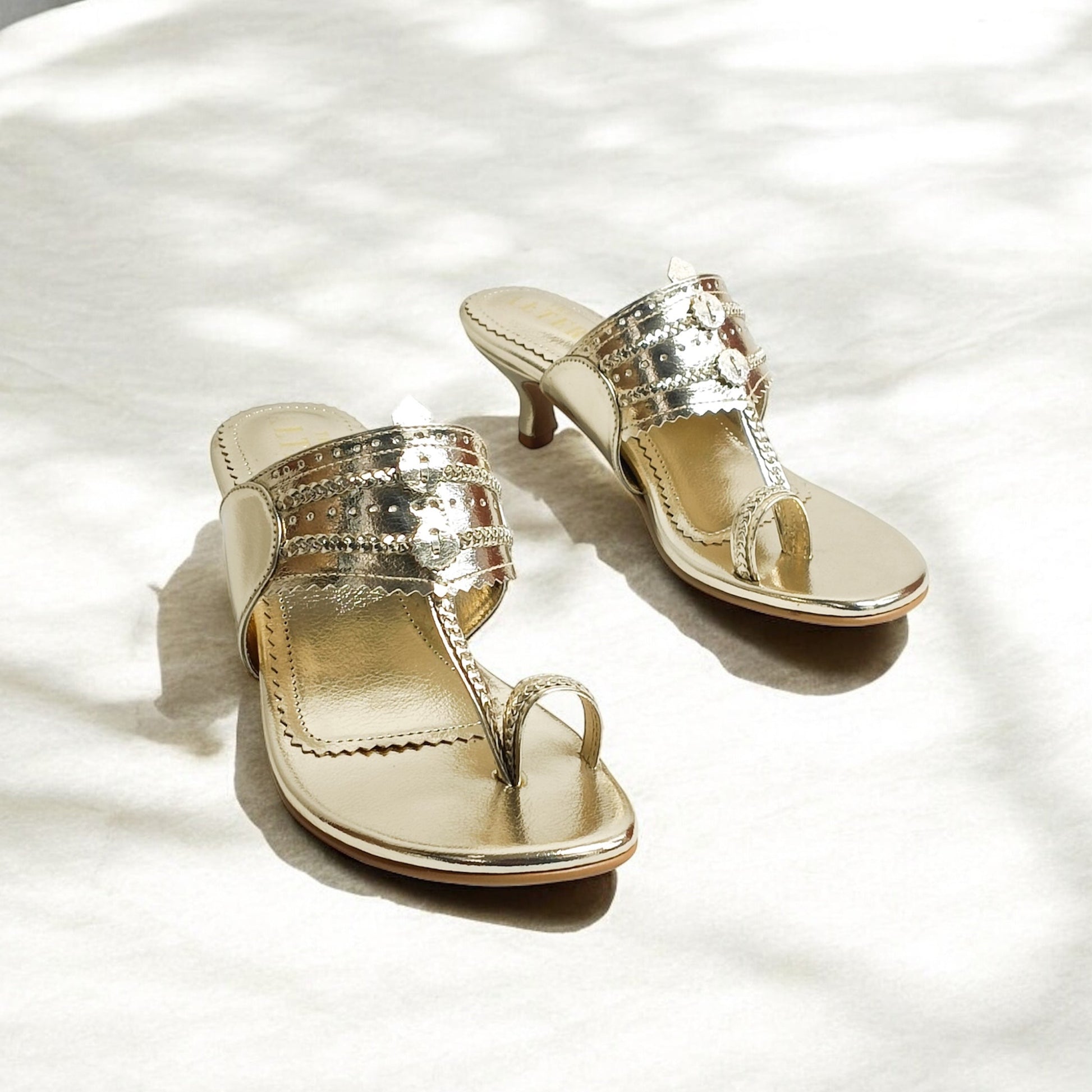 Minimal & festive these elegant subtle Indie fusion Kohla’s kitten heels have a very unique silhouette with the most comfortable kitten heels.