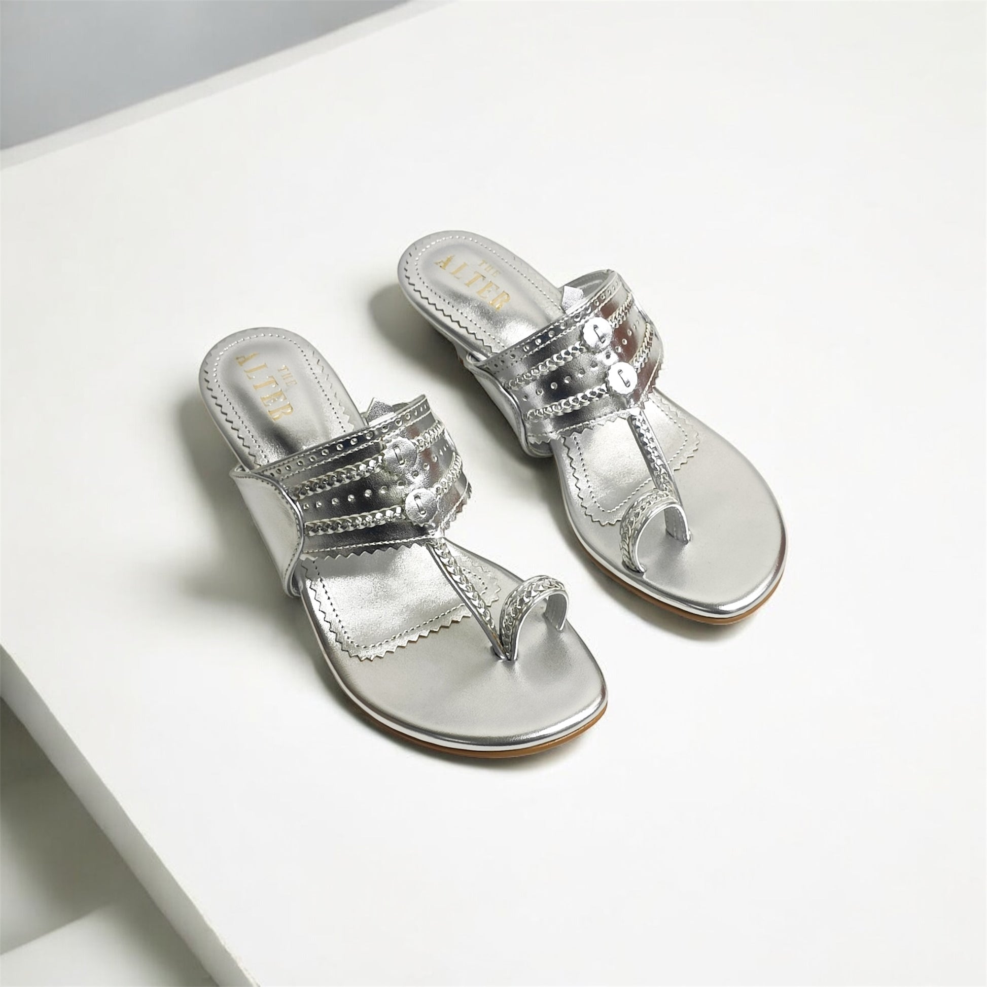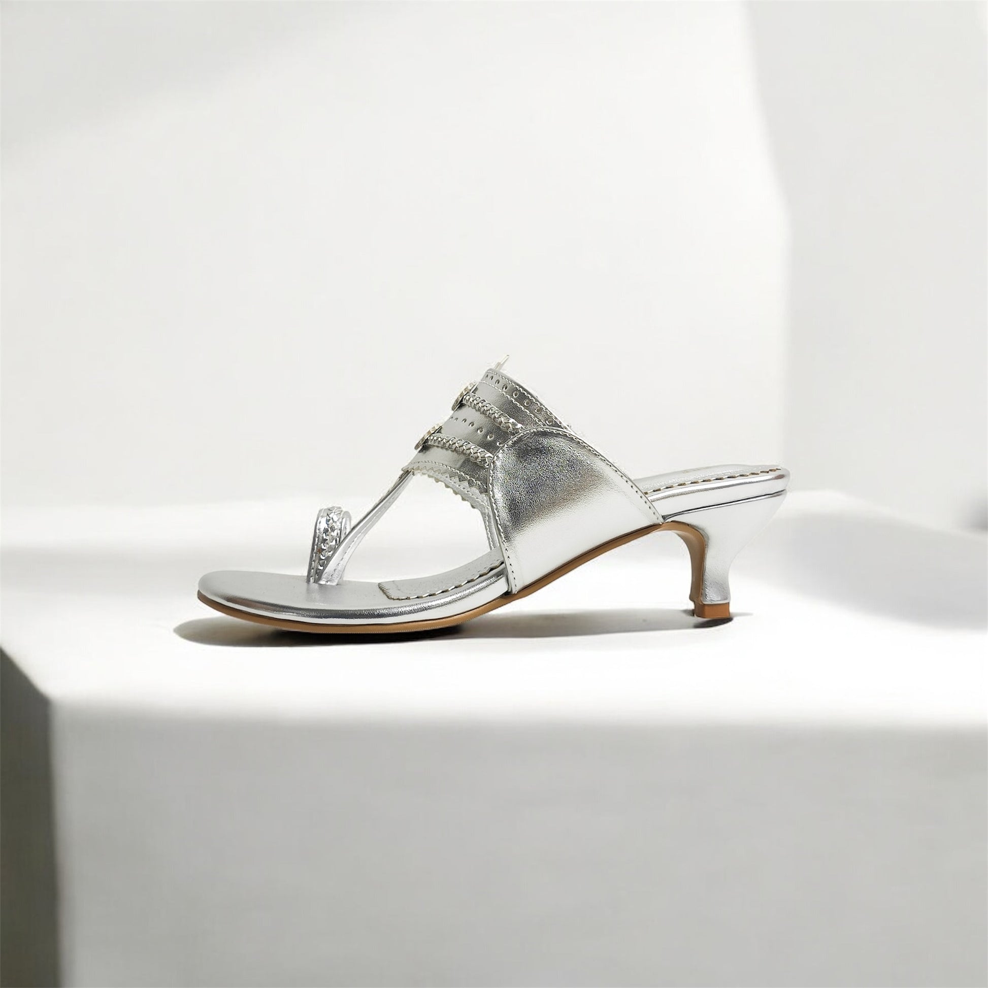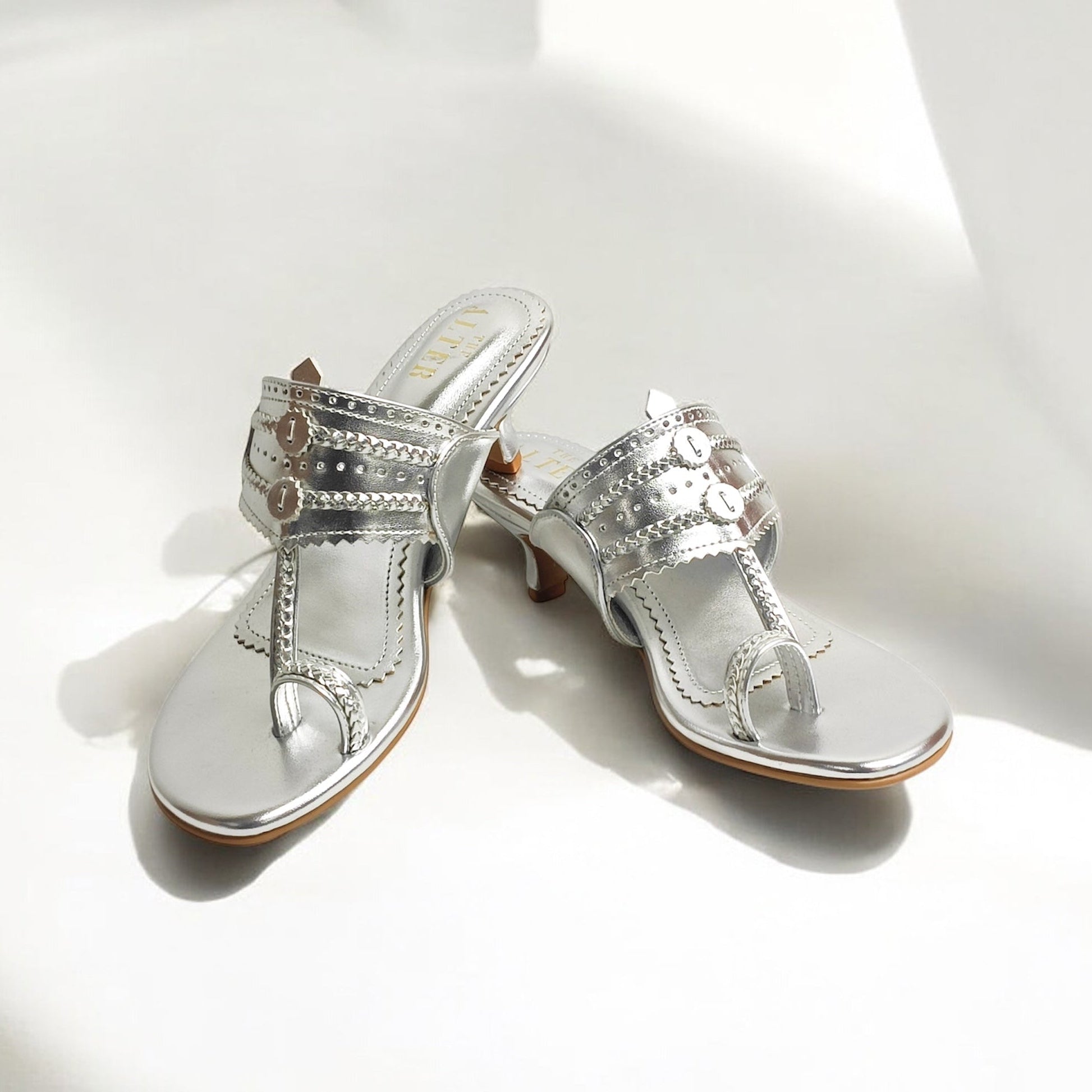 Minimal & festive these elegant subtle Indie fusion Kohla’s kitten heels have a very unique silhouette with the most comfortable kitten heels.