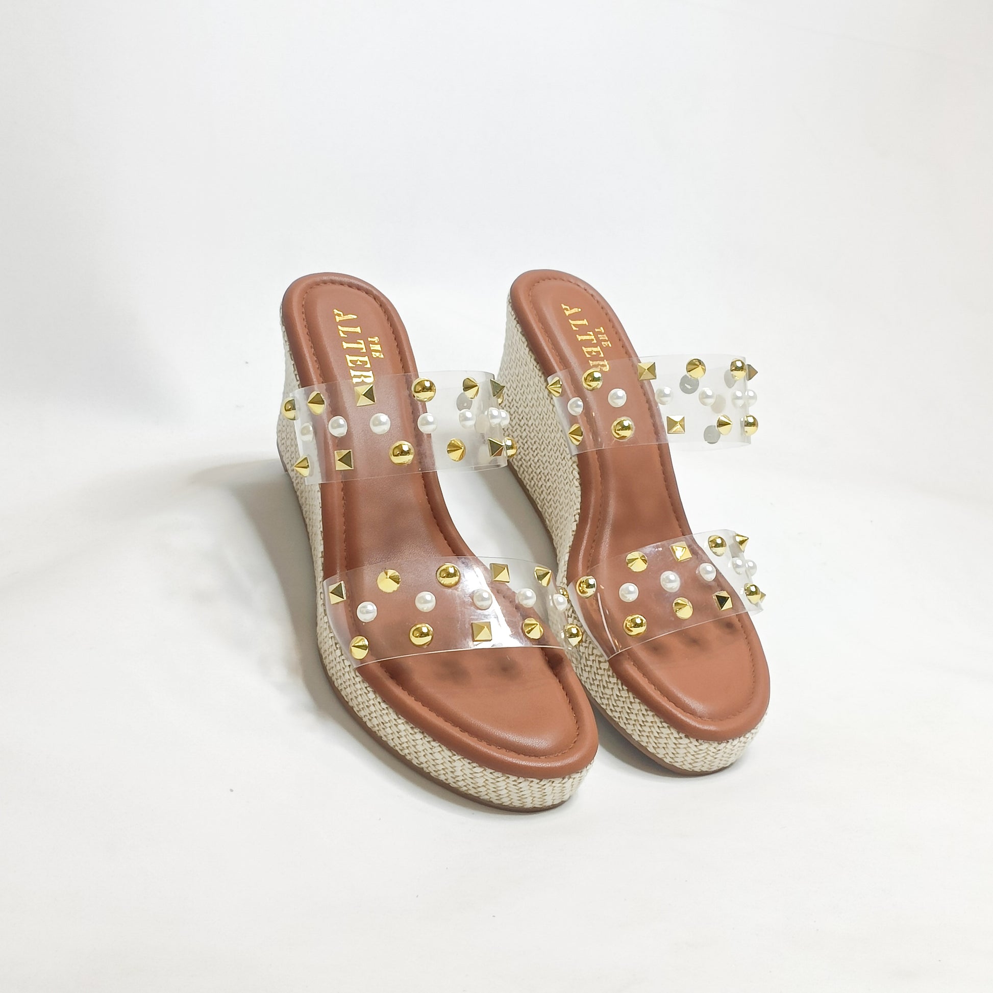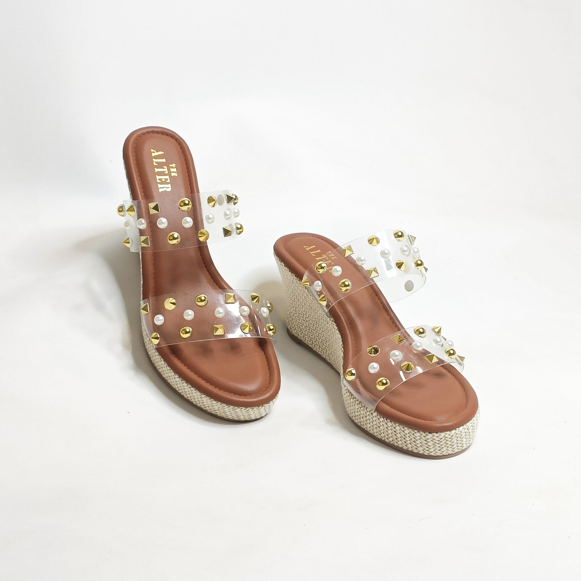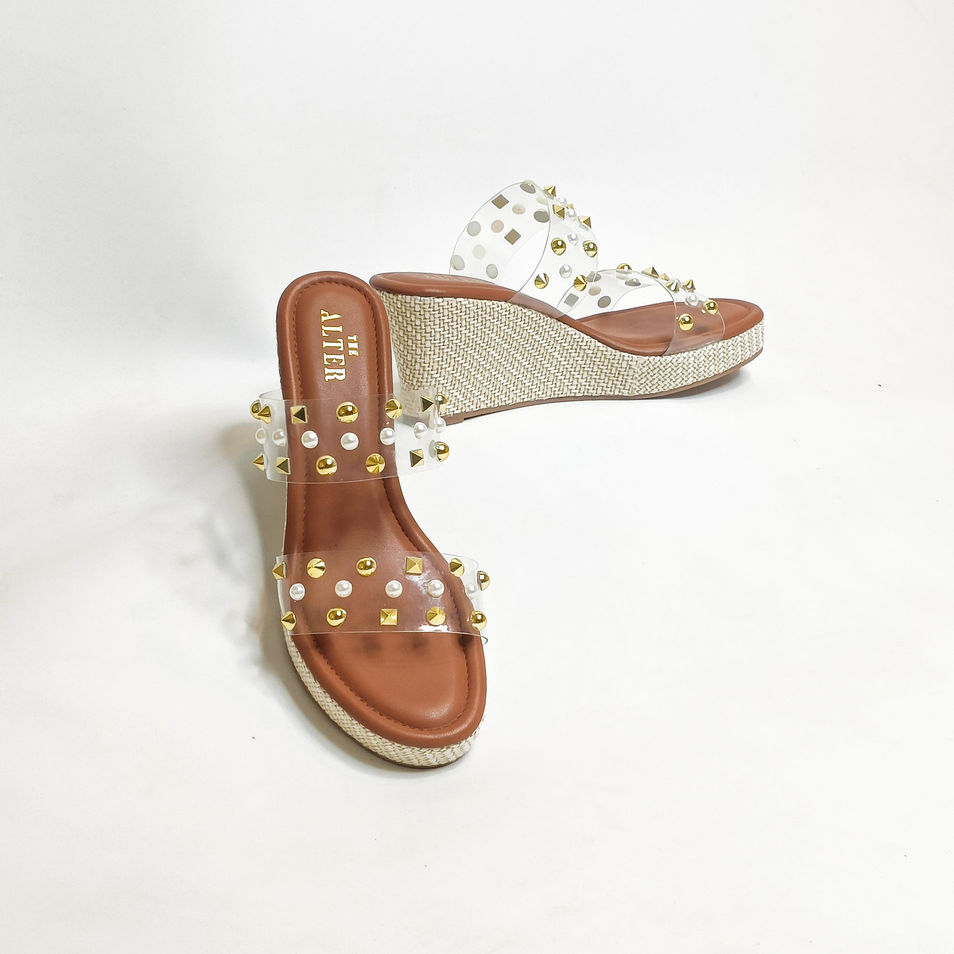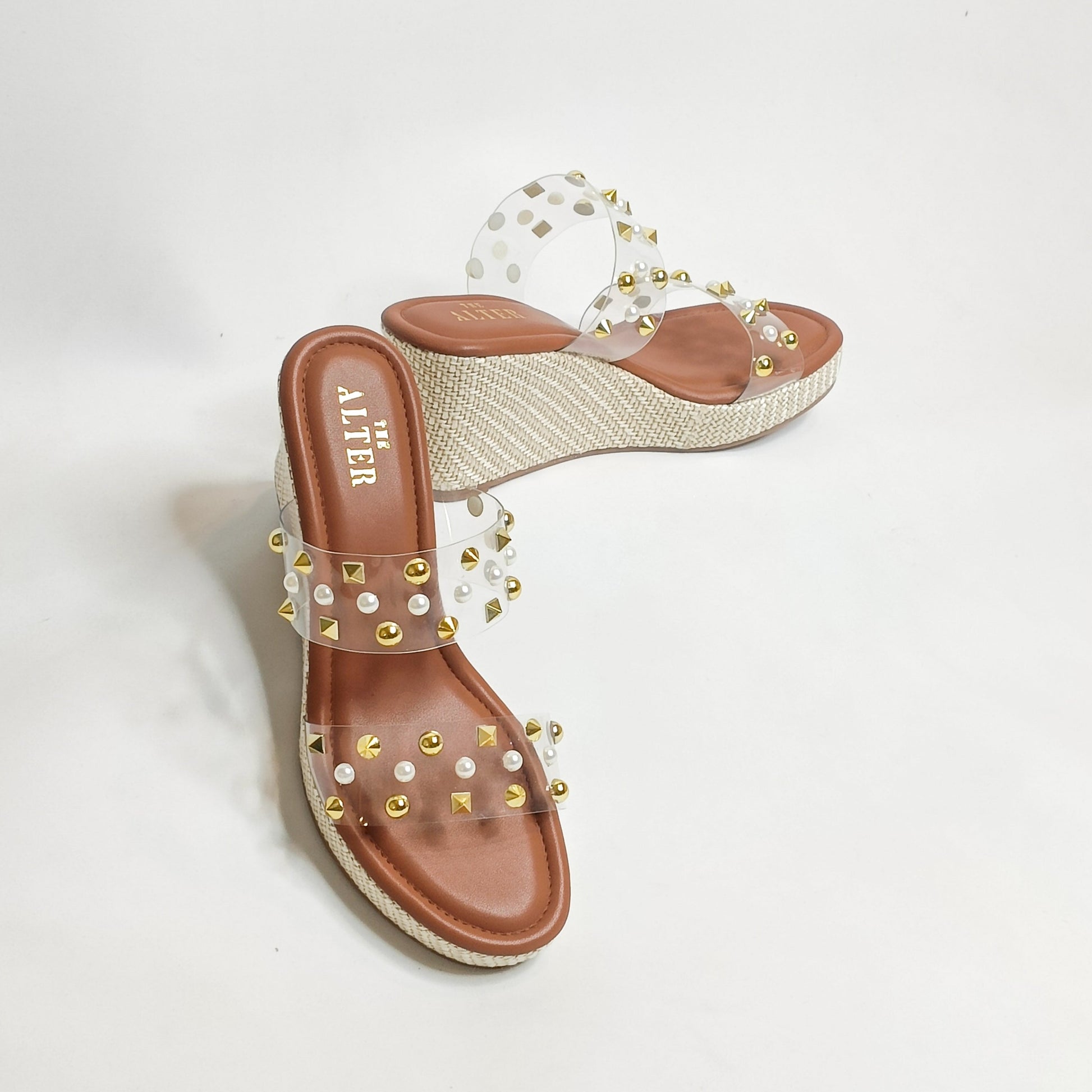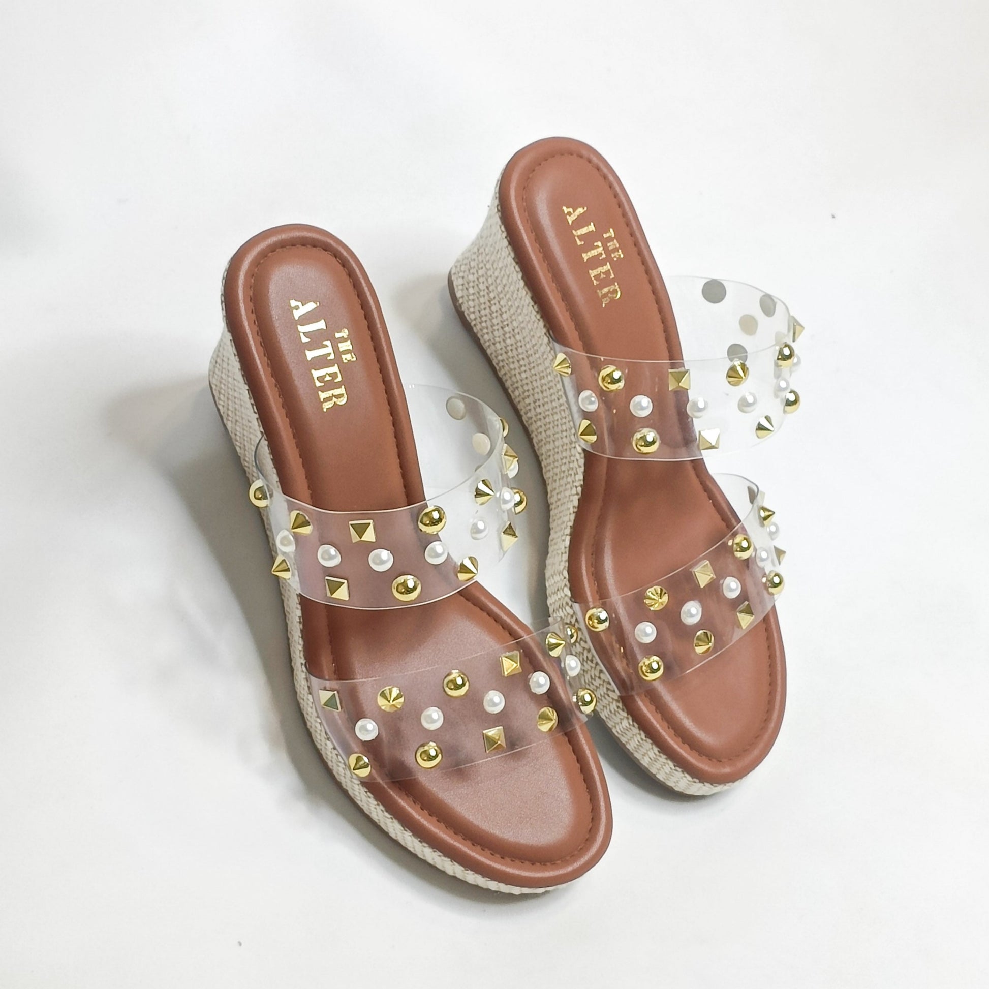 Channel your inner diva as you walk into any room wearing these Ultra Comfy fully cushioned base along with stylish Transparent Studded Two Strap Wedges handcrafted using the softest Transparent TPU fabric along with premium quality suede. Our absolute Go to pair this season.