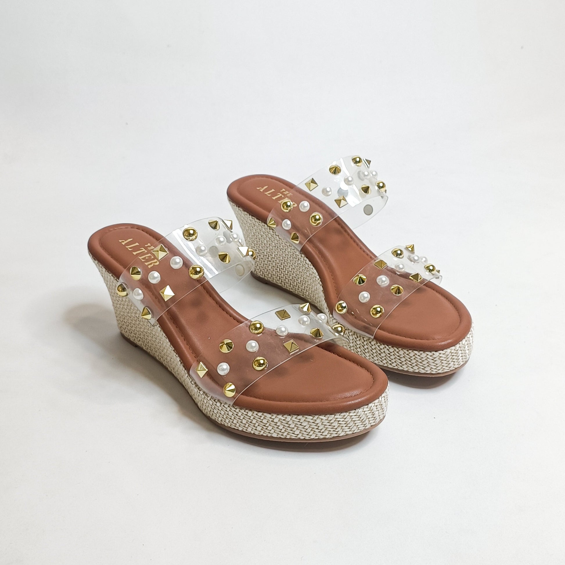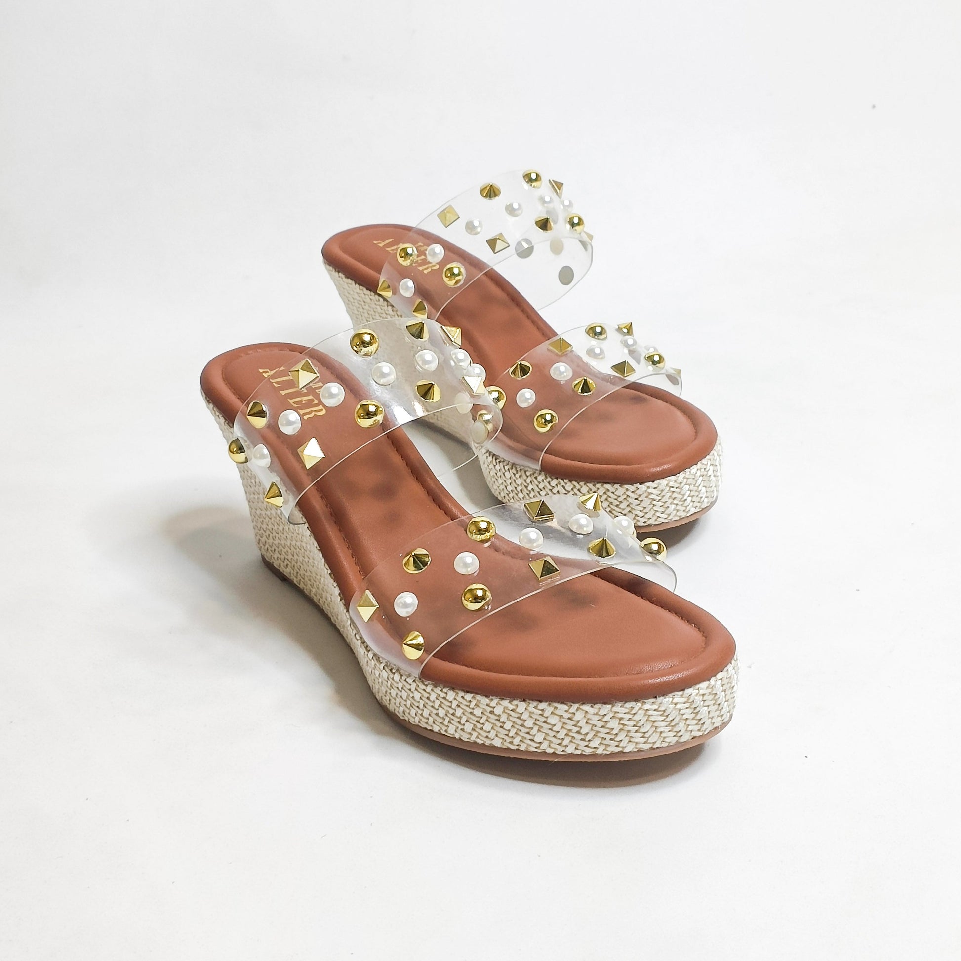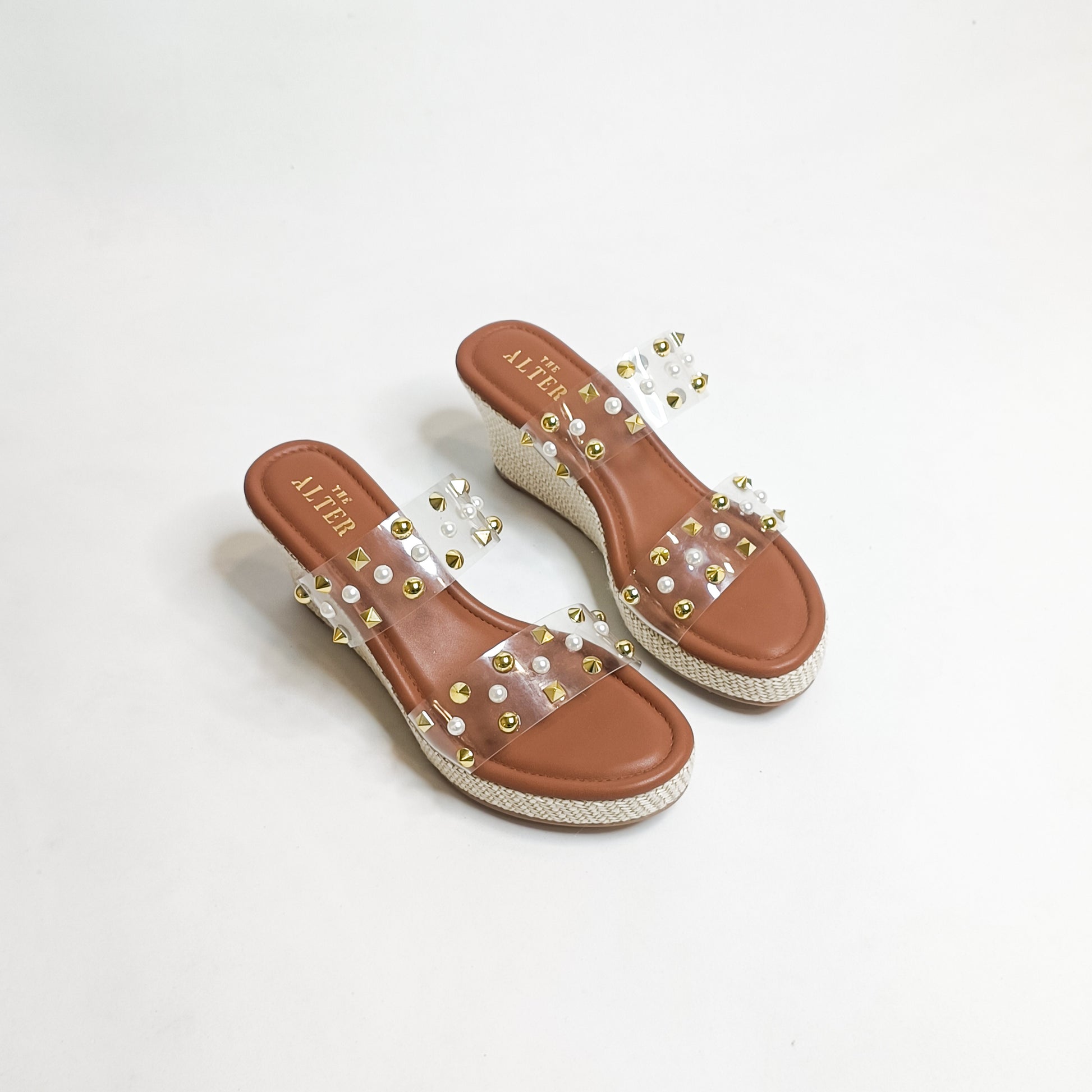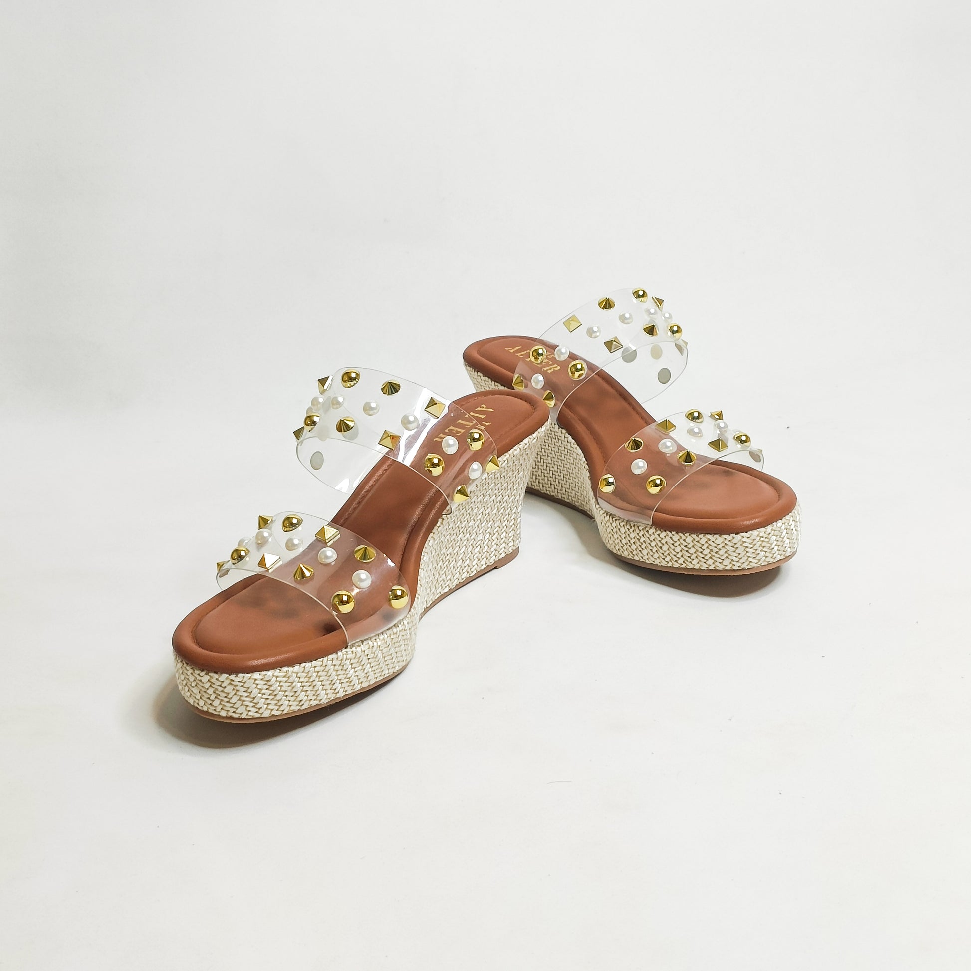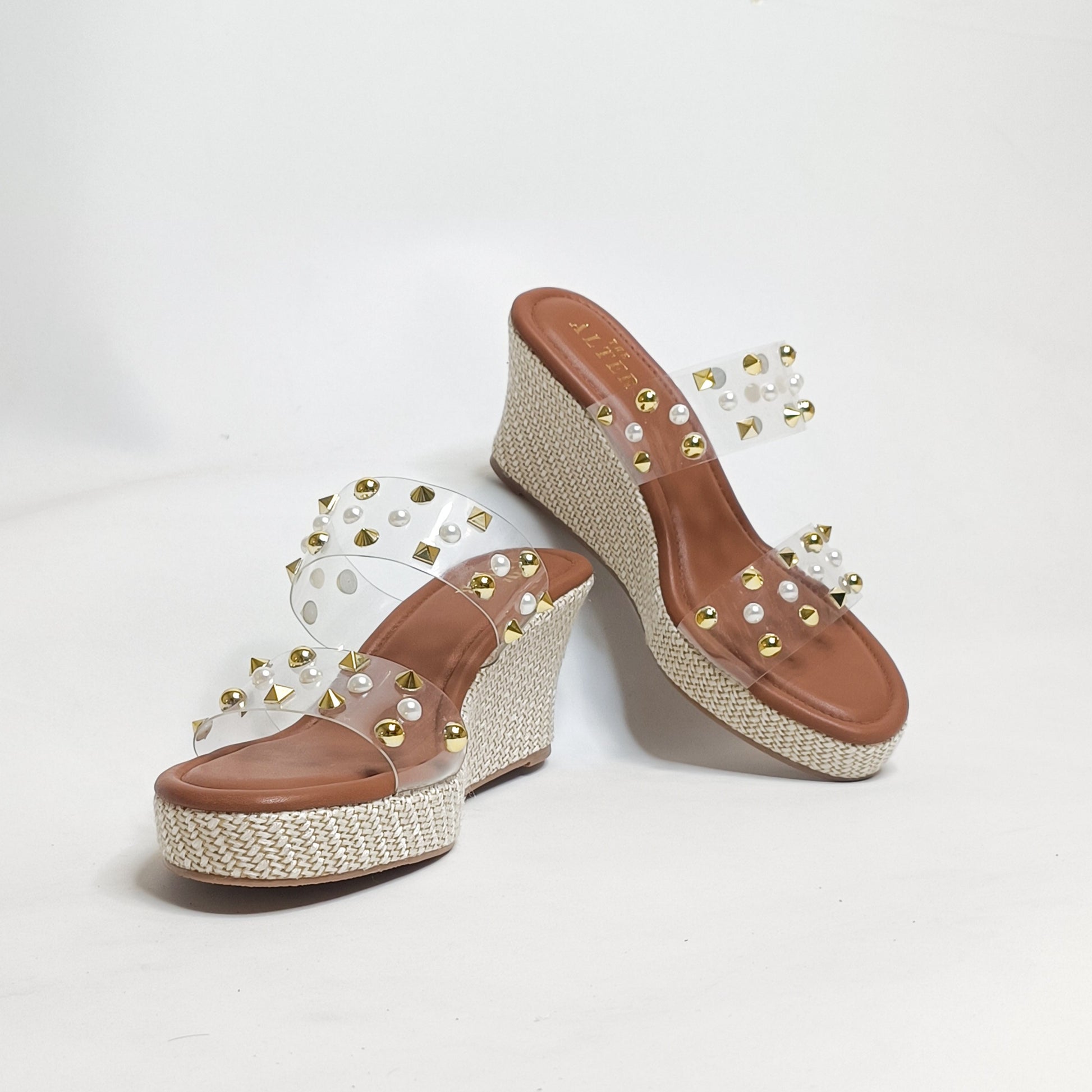 Channel your inner diva as you walk into any room wearing these Ultra Comfy fully cushioned base along with stylish Transparent Studded Two Strap Wedges handcrafted using the softest Transparent TPU fabric along with premium quality suede. Our absolute Go to pair this season.