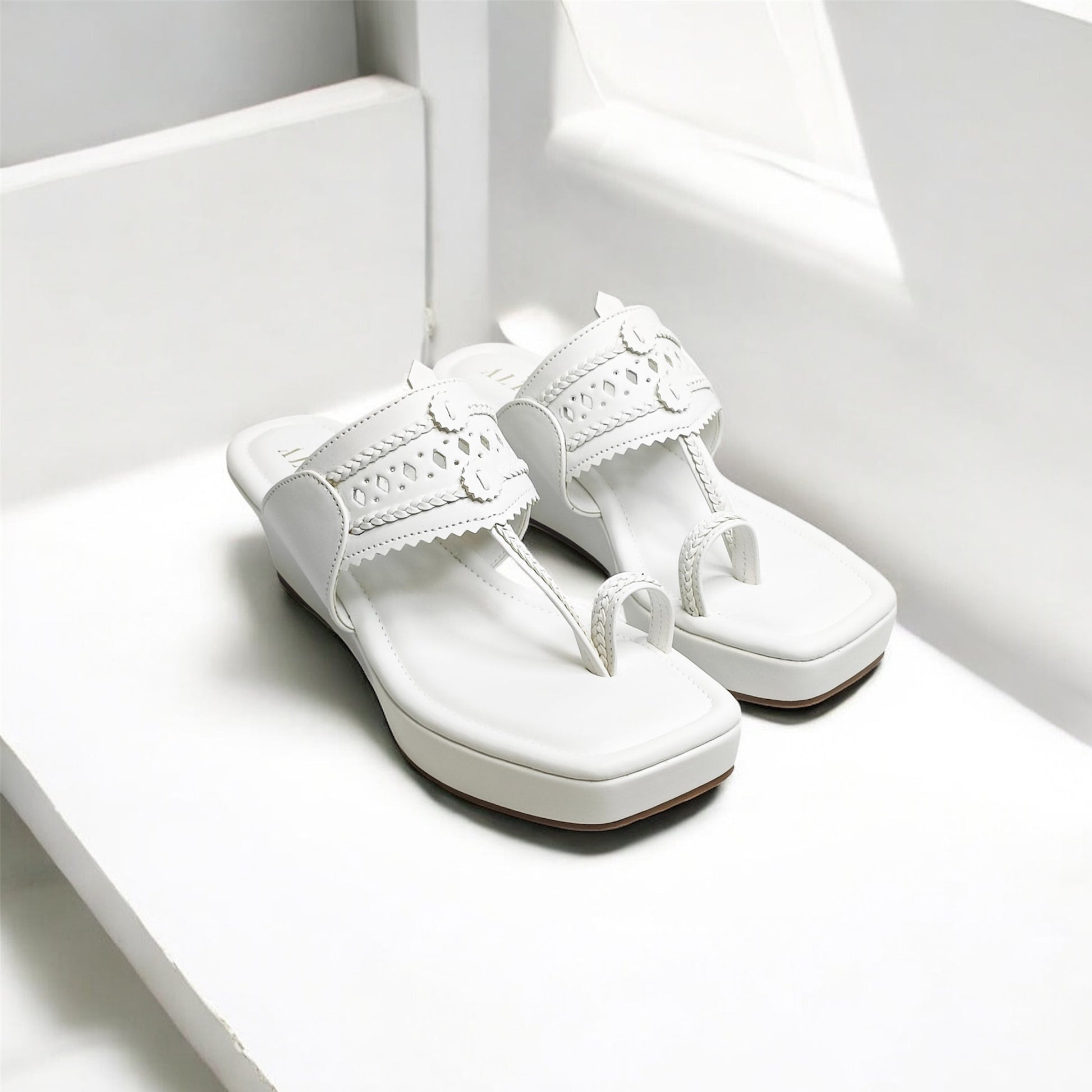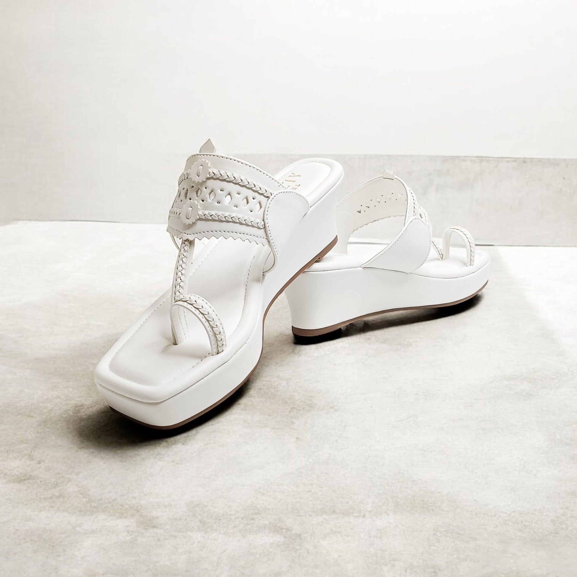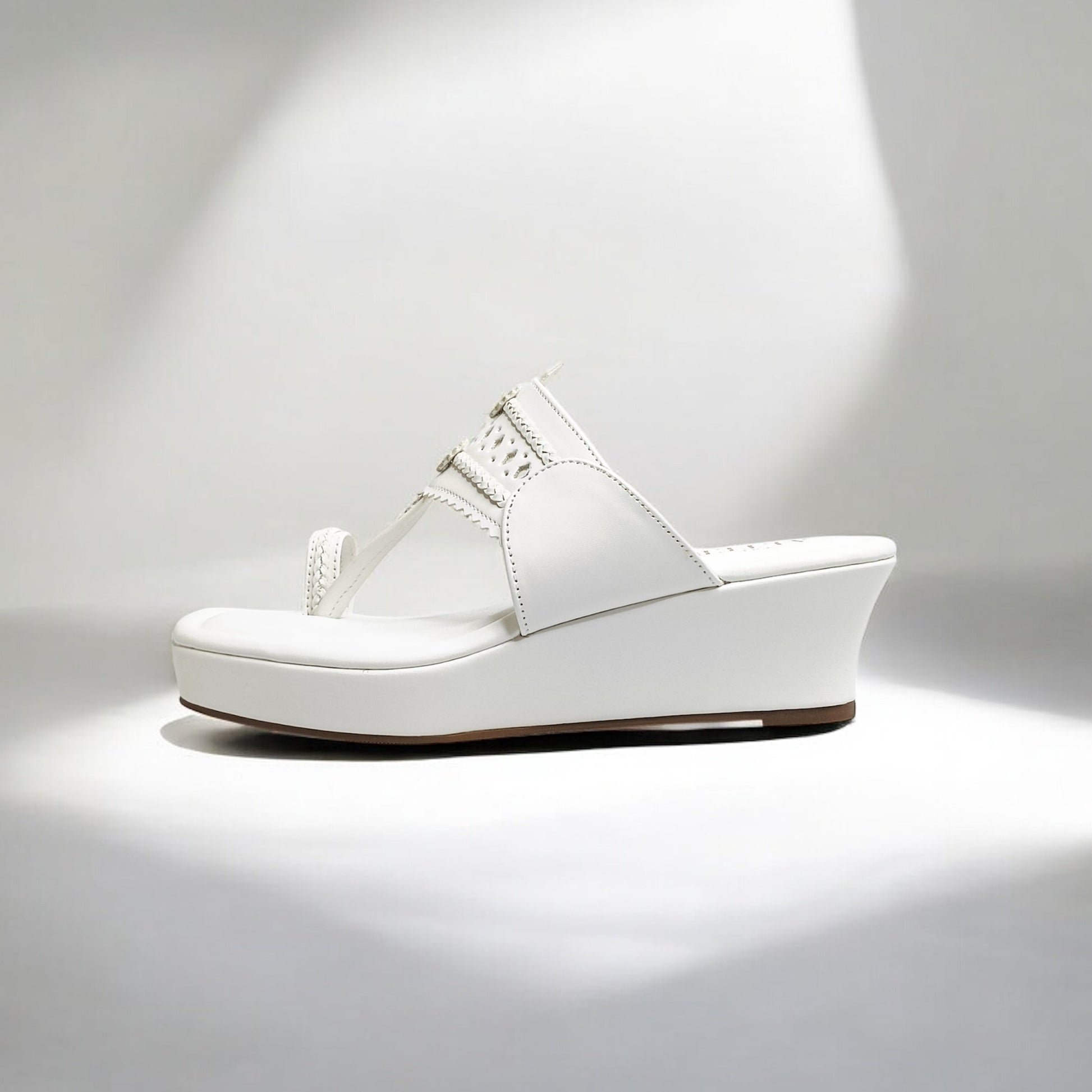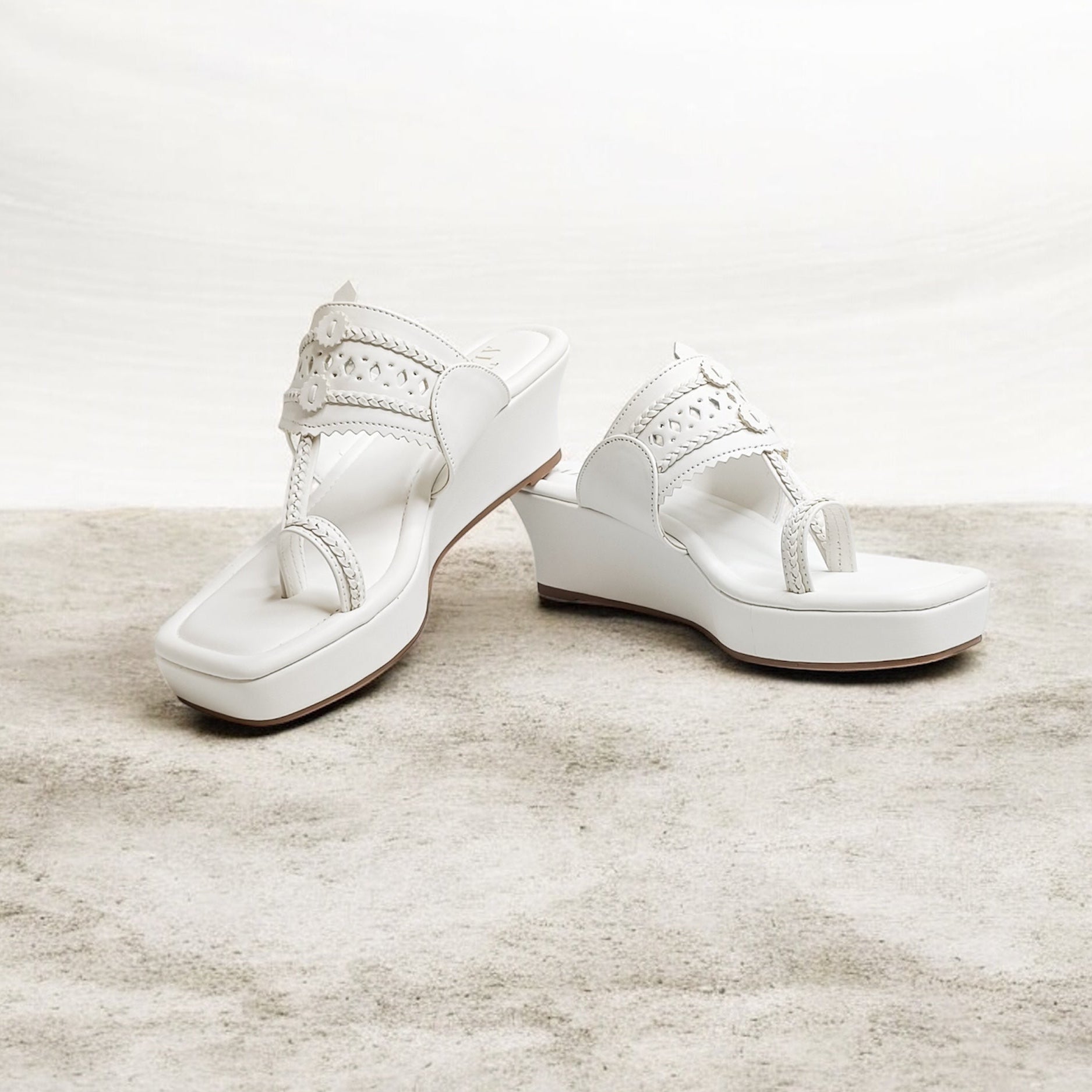 These pure white elegant kohla wedges are super versatile and handcrafted for your all day comfort A sleek and classy silhouette with 6 mm cushion insole a total must have in your shoedrobe.
